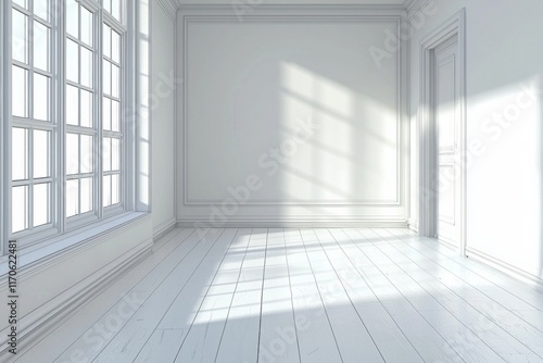 Fototapeta premium A white room with a white wooden floor, white walls, and a window on the left...