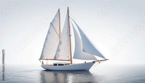 © P, Fototapeta premium A white sailboat glides across the vast ocean under a painted sunset sky