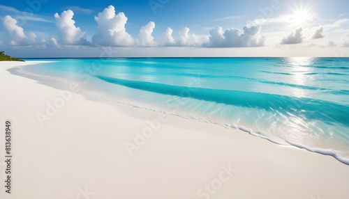 Obraz premium A white sand beach under a bright blue sky with fluffy clouds, surrounded by clear blue water