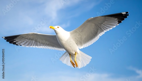 Fototapeta premium A white seagull in flight against a blue sky