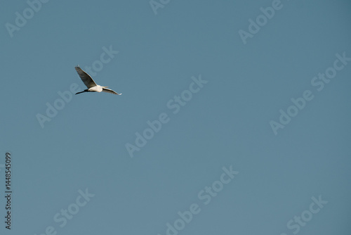Obraz premium A white seagull soars across a clear blue sky above Skadar Lake in...