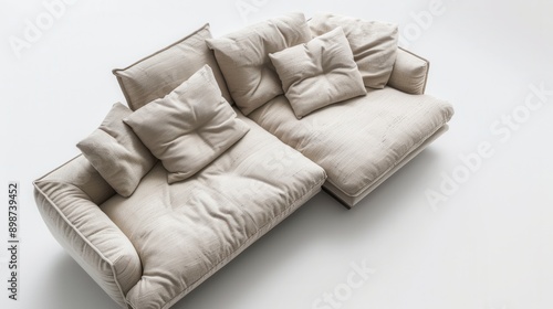 © Anat art, Obraz premium A white sectional sofa with numerous pillows sits on a white background. Generative AI
