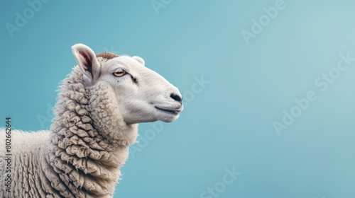 © Salander Studio, Fototapeta premium a white sheep isolated on blue studio background with space for text