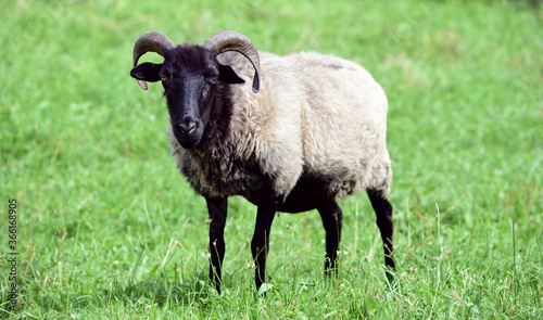 Obraz premium A white sheep with a black head and horns stands on a green pasture