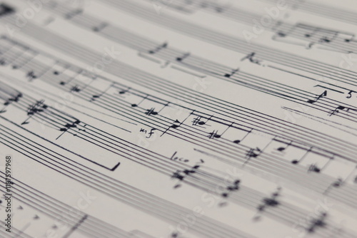 © Martine, Fototapeta premium A white sheet with a musical partition. Musical notes on a sheet of music paper. Music notes as background with a close-up view.