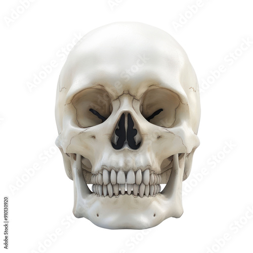 © peerasak, Obraz premium A white skull with a smile on it, 3D illustration, Halloween, Clipart, 3d render, isolate on a transparent background.