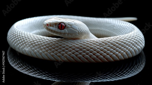 Fototapeta premium A white snake with red eyes on a black surface