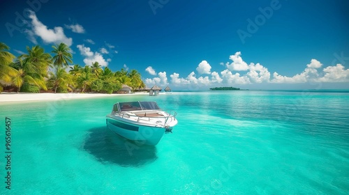 Fototapeta premium A white speedboat is anchored in crystal-clear turquoise sea, just off the coast of a secluded island.