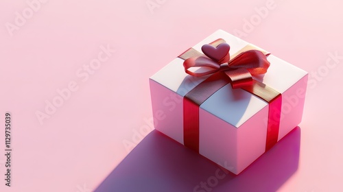© sadewotito, Fototapeta premium A white square gift box with a red and gold ribbon and two small hearts on a pink background.
