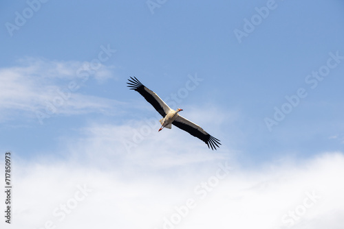© Alen, Fototapeta premium A white stork in flight. A cloudy sky in the background of the animal.