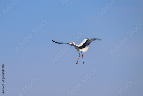 Fototapeta premium A White Stork in flight blue sky