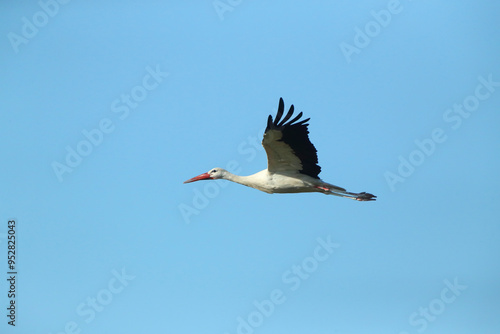 Fototapeta premium A White Stork in flight blue sky Weißstorch im Flug