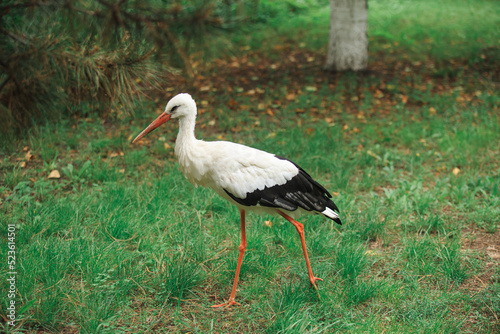 Fototapeta premium A white stork walks freely on a green lawn, a beautiful bird in its natural habitat.