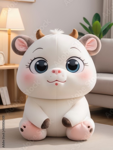 © Olga, Fototapeta premium A white stuffed animal cow with horns and a blue eye