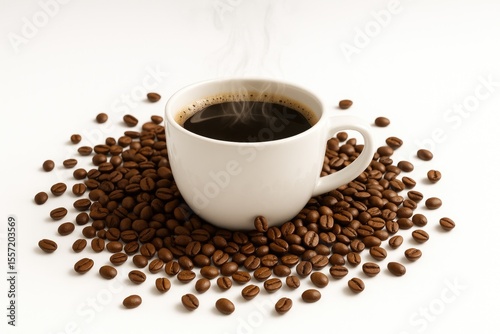 © AkuAku, Fototapeta premium A white surface featuring a coffee cup alongside scattered coffee beans