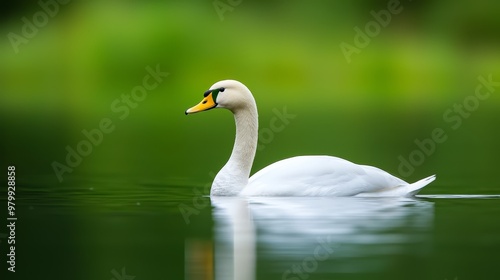 Fototapeta premium A white swan floats atop a tranquil lake Nearby, a lush forest teems with...