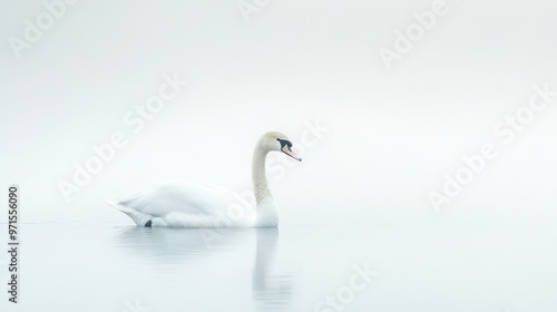 © Rere_Art151, Fototapeta premium A White Swan Gracefully Navigates Calm Waters Against a Misty Background