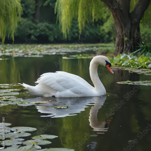 © MAJIB, Naklejka premium a white swan swimming in a pond with lily pads