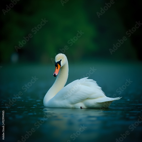 © Masum, Fototapeta premium A white swan with a distinctive orange beak is gracefully floating on a serene body of water, with a blurred green background.