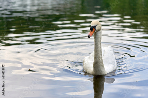 © A, Fototapeta premium A white swan with a long neck and a red beak floats on the water