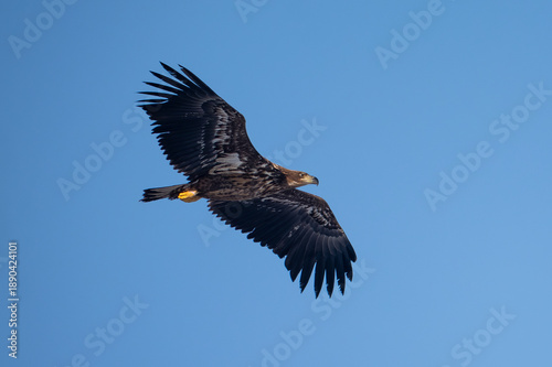 Fototapeta premium A white-tailed eagle in flight against a blue sky