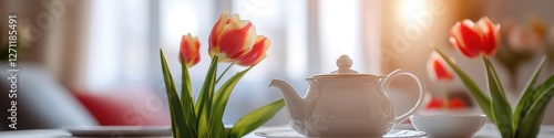 © Ева Поликарпова, Naklejka premium A white tea pot sits on a table, ready for use