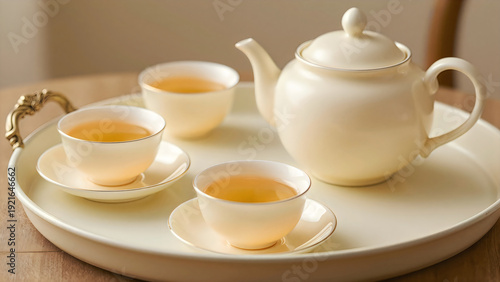 Fototapeta premium A white tea set on a wooden table