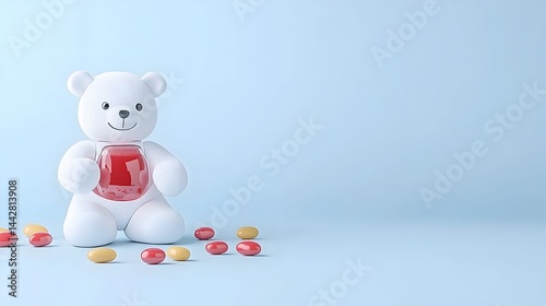 © LAILY, Obraz premium A white teddy bear holds a translucent jar of red jelly, surrounded by scattered red and yellow candies on a light blue background