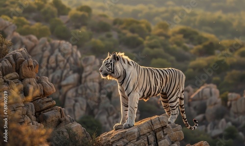 Fototapeta premium A white tiger standing tall on a rocky outcrop