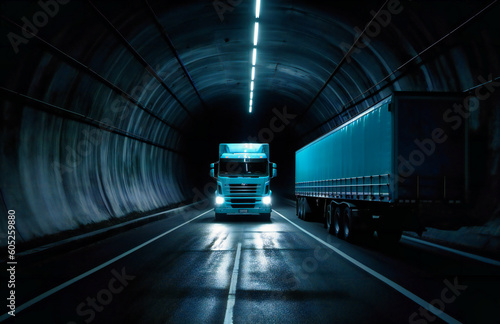 © Nilima, Fototapeta premium a white truck driving down a dark tunnel
