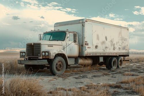 © Fotograf, Fototapeta premium A white truck parked in a green field, surrounded by nature