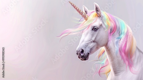 Fototapeta premium A white unicorn with a rainbow mane on a light purple background.