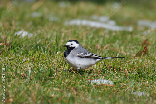 © Mariia, Fototapeta premium a White wagtail stands on the green grass perpendicular to the camera lens on a spring sunny day.