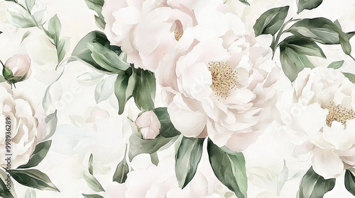 © Igor, Fototapeta premium A white wallpaper featuring white flowers and green foliage on a white background, with white flowers and green leaves overlaid on top