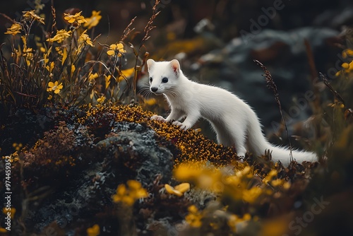 © enter, Fototapeta premium A white weasel stands alert on a rock, surrounded by soft-focus greenery, with a curious expression and bright eyes.