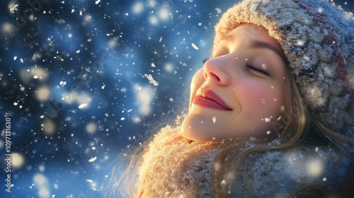 © Oliver, Fototapeta premium a white woman witch a white hat and scarf who is enjoying the winter with snowflakes falling in her face.