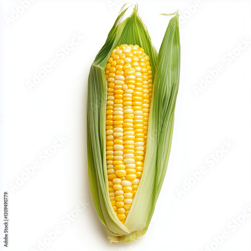 Obraz premium A whole fresh corn cob with bright yellow kernels and green husk partially peeled, isolated on a white background