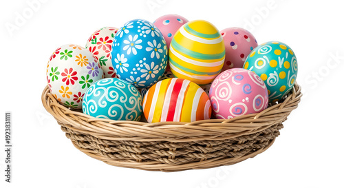 Fototapeta premium A wicker basket filled with colorful Easter eggs on transparent background