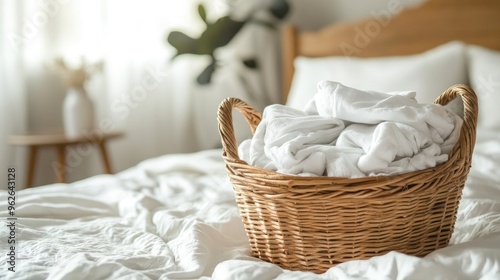 Obraz premium A wicker basket holding folded, clean laundry, placed on a bed with fresh white linens and a cozy bedroom atmosphere
