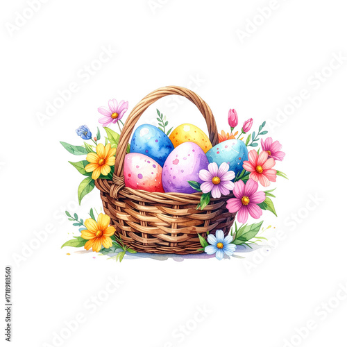 Fototapeta premium A wicker basket overflowing with colorful Easter eggs and spring flowers