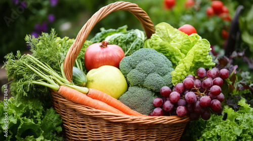 © Elmin, Fototapeta premium A wicker basket overflowing with fresh vegetables and fruits--broccoli, carrots, tomatoes, lettuce, grapes, apples, onions, and cabbage--arranged in a vibrant outdoor garden setting.