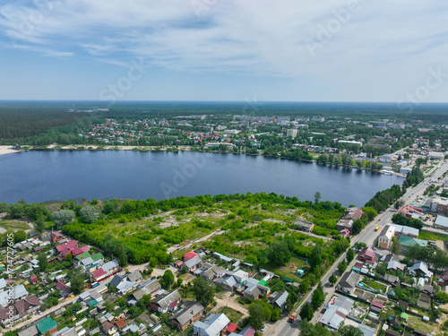 Obraz premium A wide aerial view of Gus Khrustalny, showing residential houses along the shore of a large lake with green fields and a dense forest on the horizon.