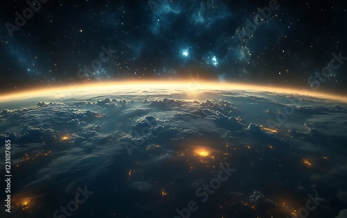 © Dai, Obraz premium A wide-angle perspective of Earth floating in the vastness of space, with a glowing atmosphere separating it from the dark void