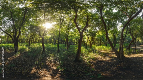 © kamral, Naklejka premium A wide-angle shot of a pristine forest with sunlight filtering through the trees