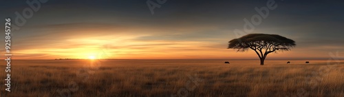 Fototapeta premium A wide-angle shot of a savanna ecosystem at sunrise, showing the energy...