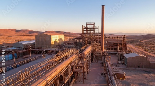 © Artittaya, Fototapeta premium A wide-angle shot of a zinc processing facility with chimneys and metal pipes