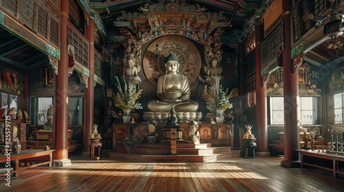 Fototapeta premium A wide-angle shot of an ubosot's interior, highlighting the central Buddha...