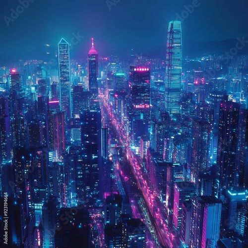 © PsixoloqOrxan, Obraz premium A wide-angle view of a city skyline at night, digitally enhanced with vibrant neon lights