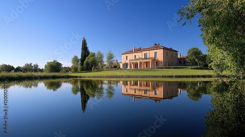 © peerawat, Fototapeta premium A wide-angle view of a French reflected in a serene moat under a clear blue sky