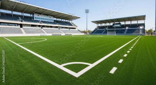 © adobesantren, Obraz premium A wide-angle view of a modern soccer stadium with a pristine, green field, and empty seating.